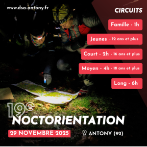 Défis Sports Aventures (DSA) organise le samedi 29 novembre, sa 19e édition de la Noct’Orientation à Antony (92). Il s’agit d’une course d’orientation à pied, de nuit.